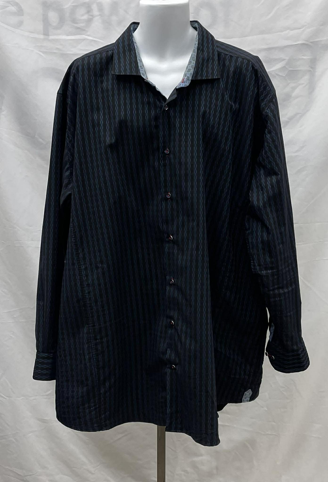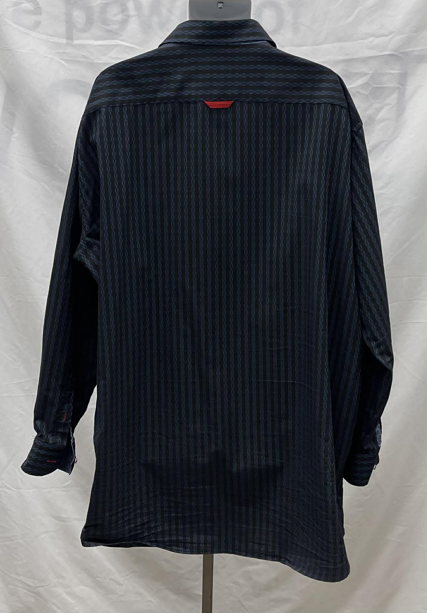 Details: Men's black and midnight blue patterned, collared, long sleeve Hechter shirt.