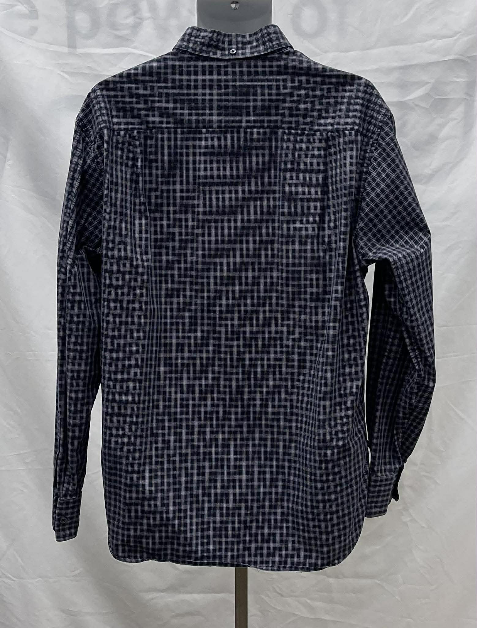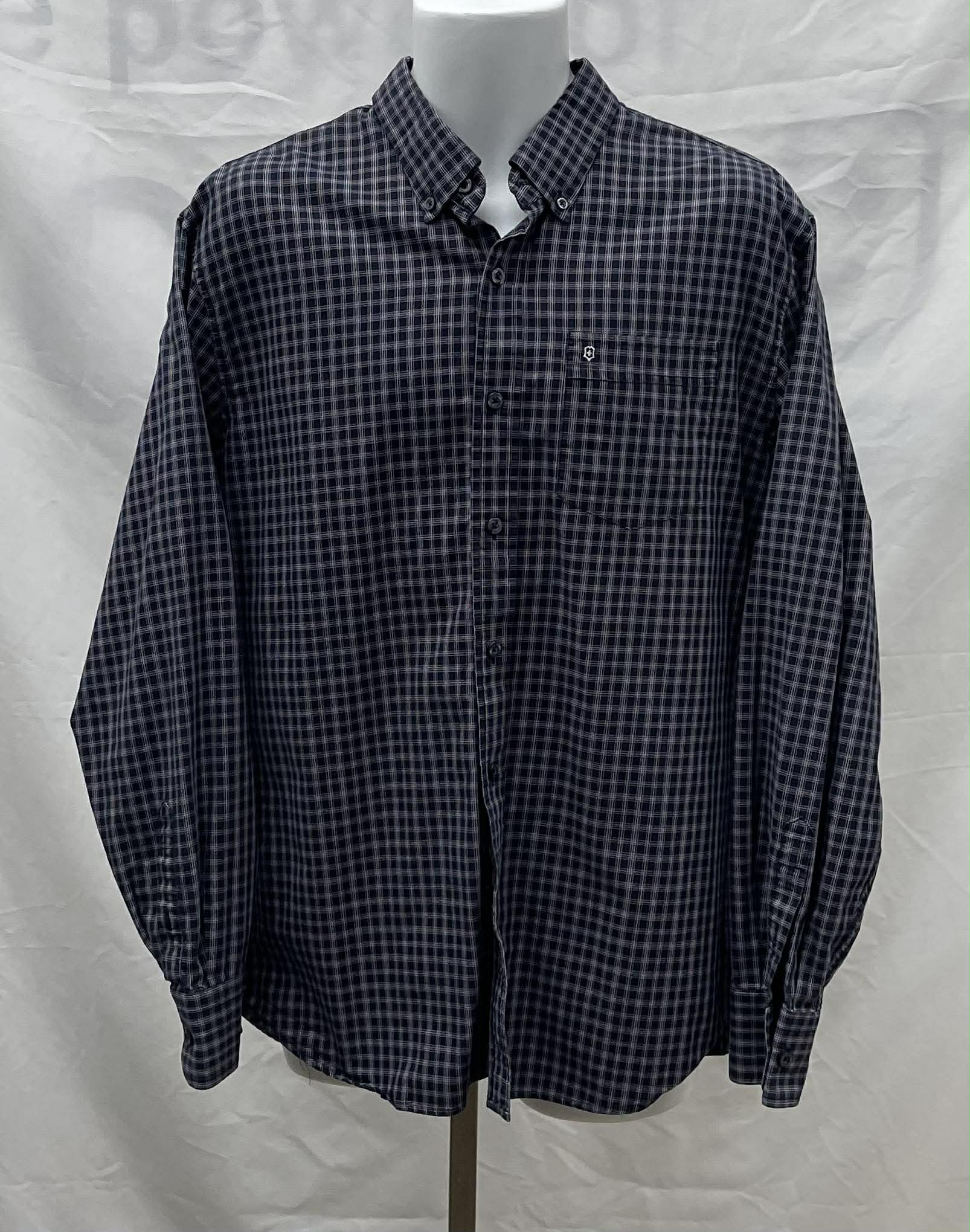 Details: Men's dark blue and white plaid, collared, long sleeve Victorinox shirt.
