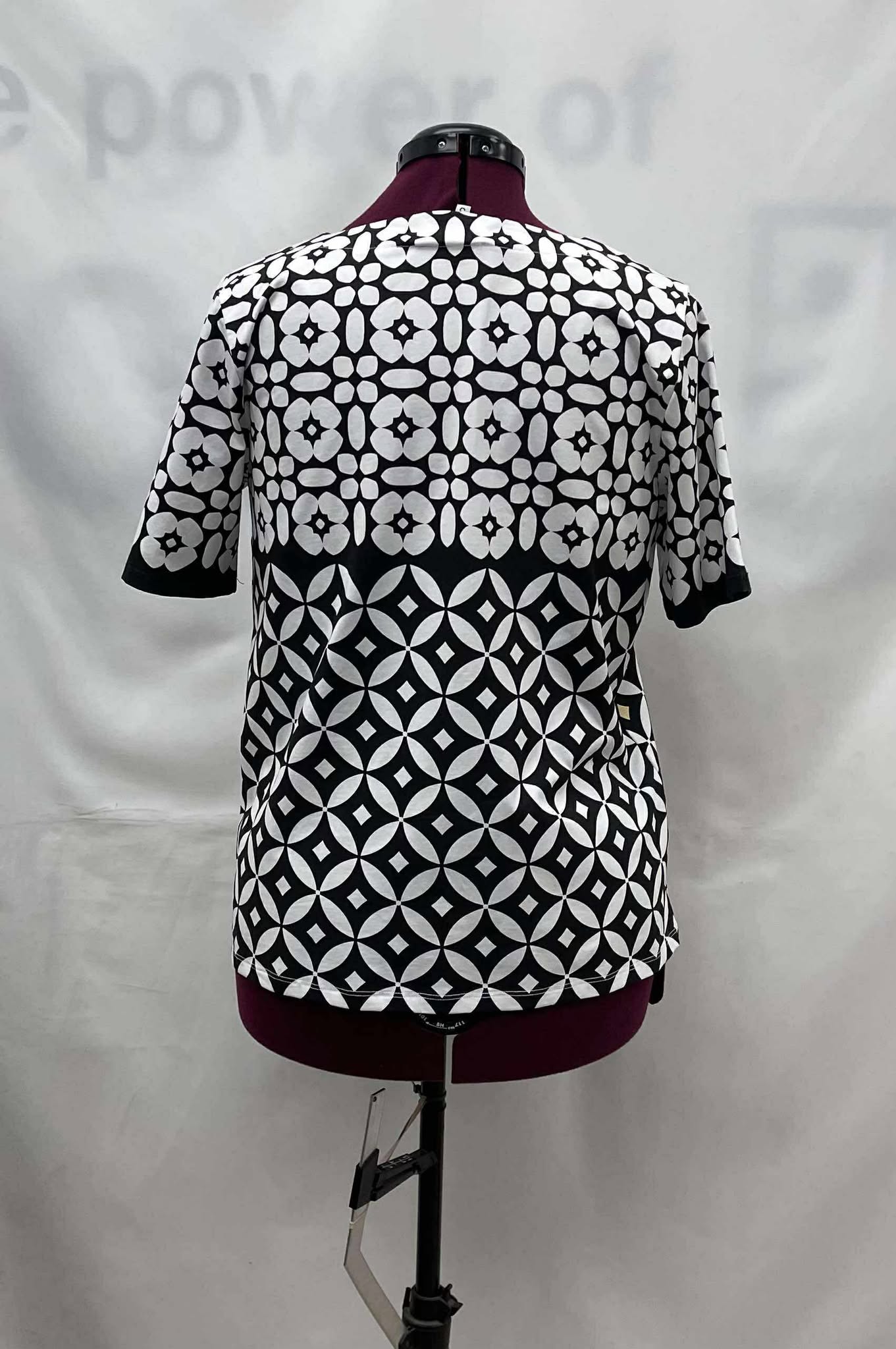 Details: Women's white, black, and gold coloured mosaic print, short sleeve Leo & Ugo top. ( As Is / Not Authenticated )