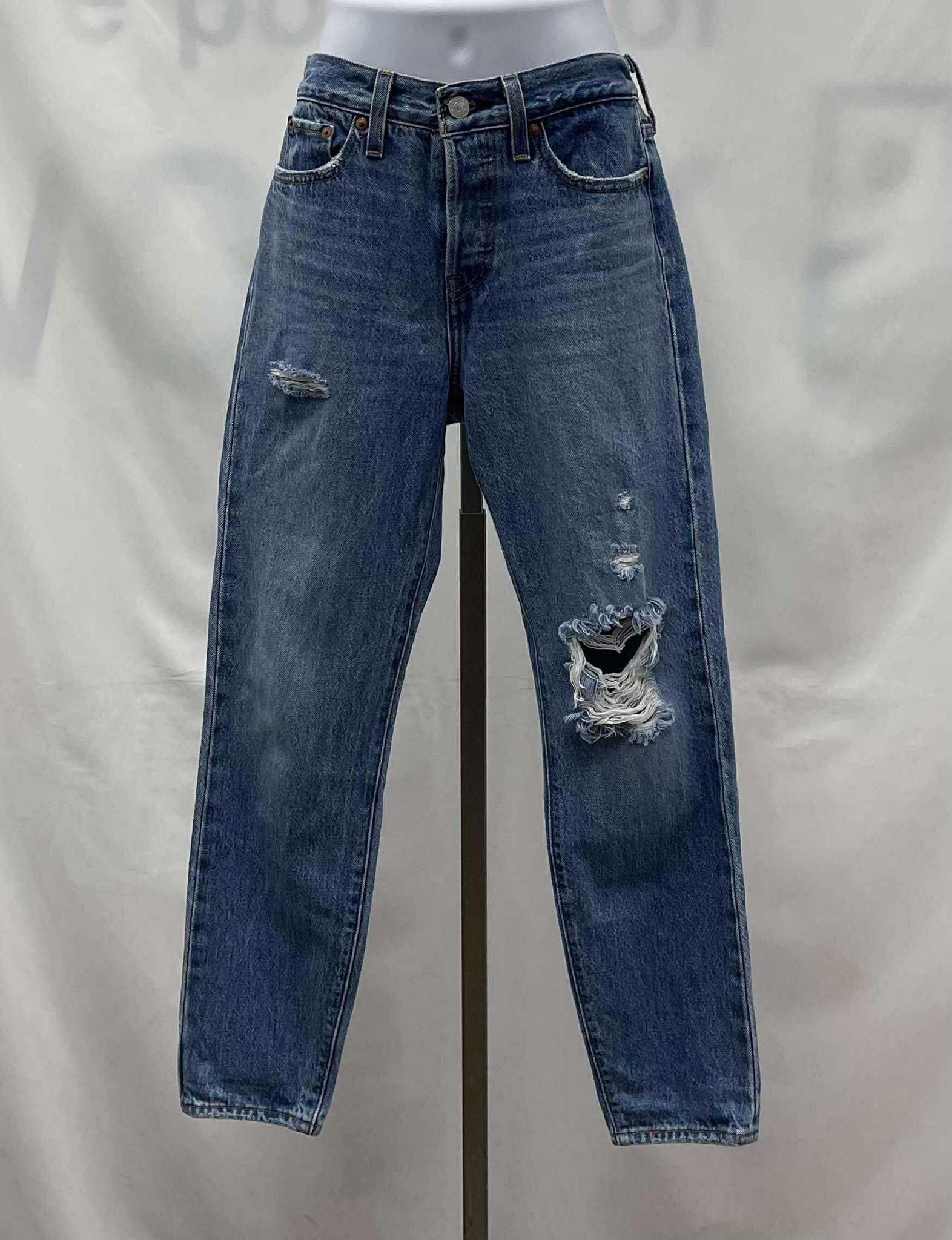 Details: Women's blue worn denim Levi's jeans.