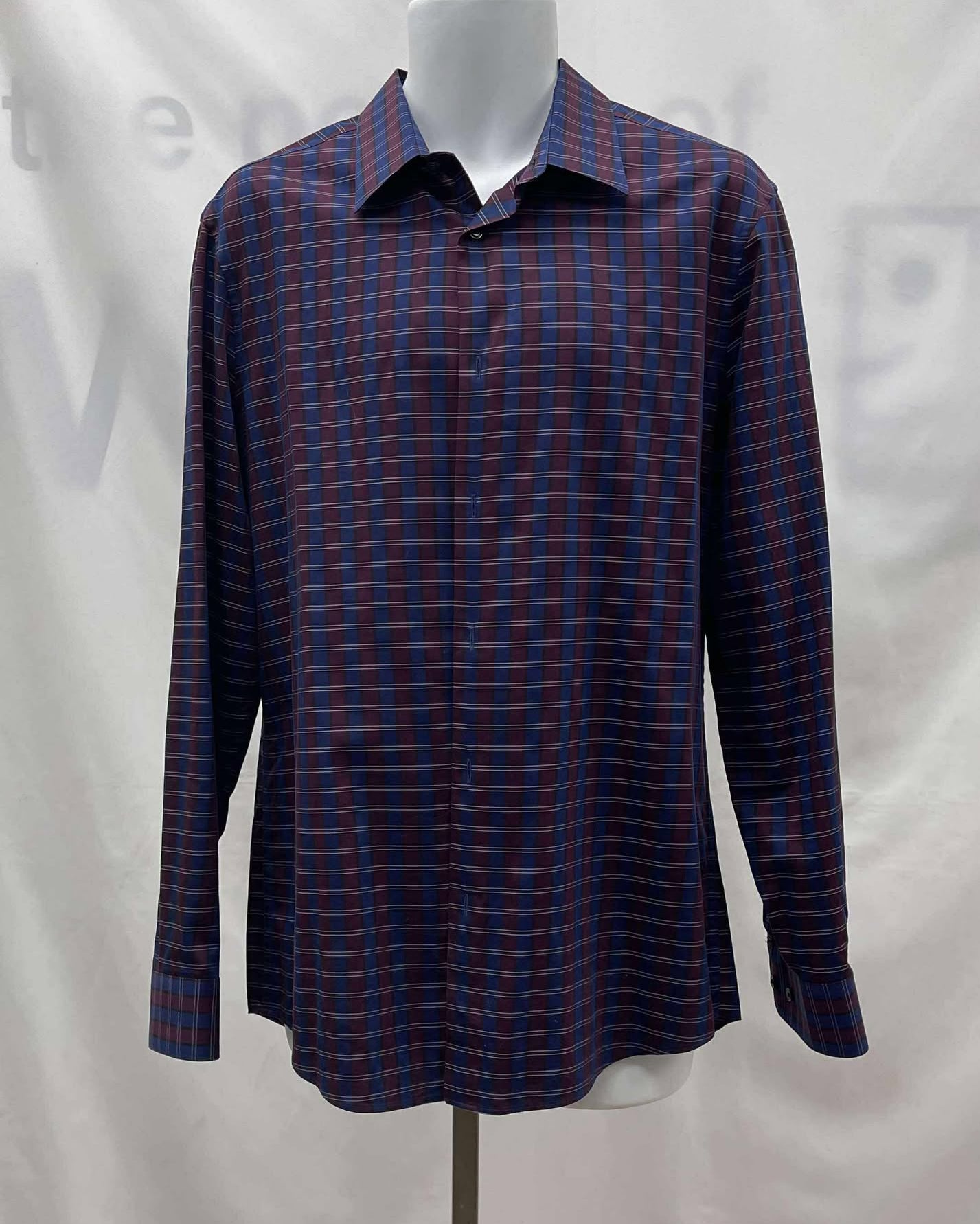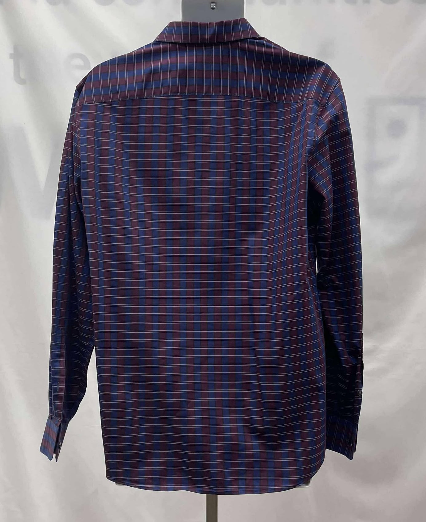 Details: Men's burgundy and navy blue plaid, collared, long sleeve Perry Ellis shirt.