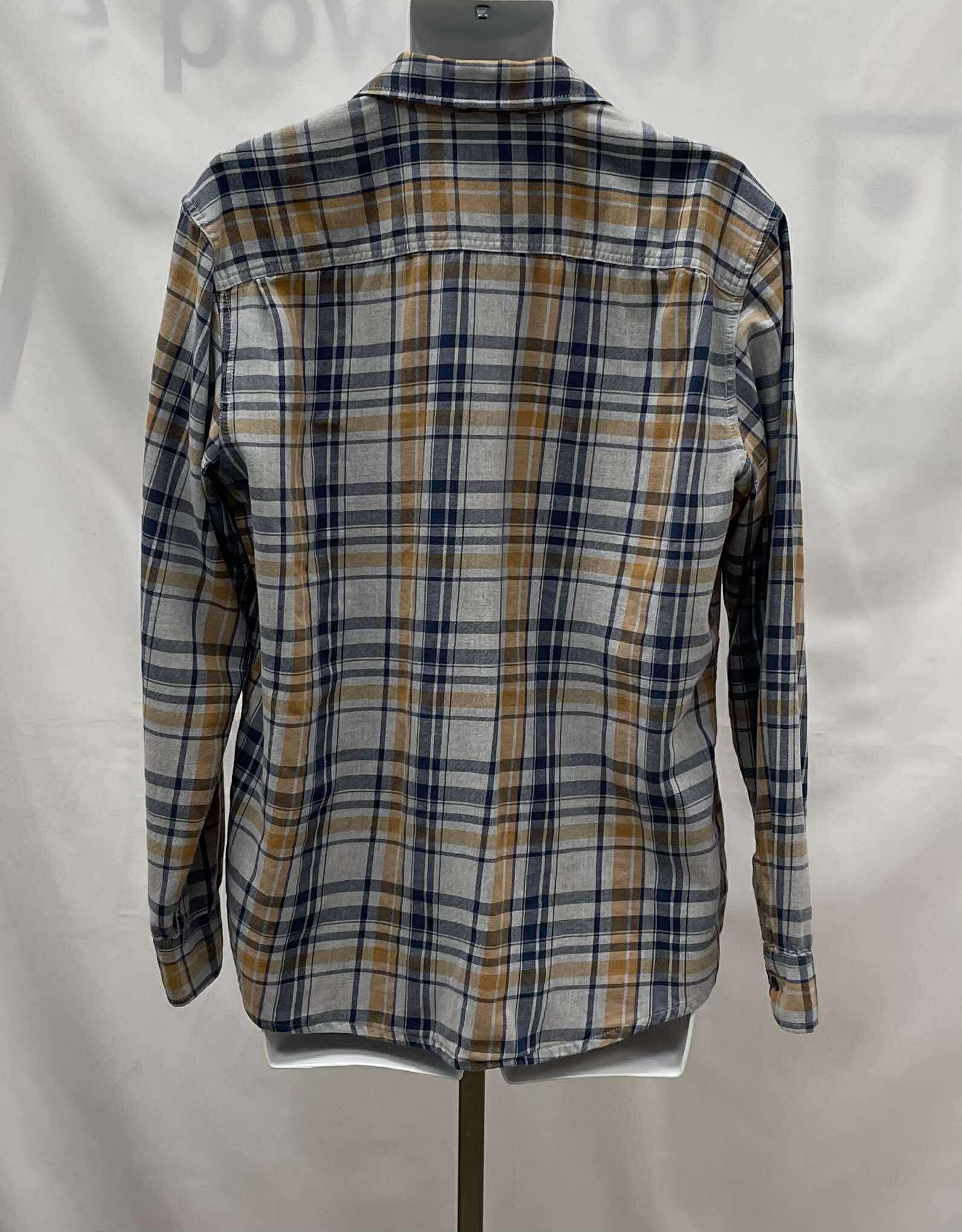 Details: Men's grey, blue and light brown checkered Prana long sleeve  button up shirt