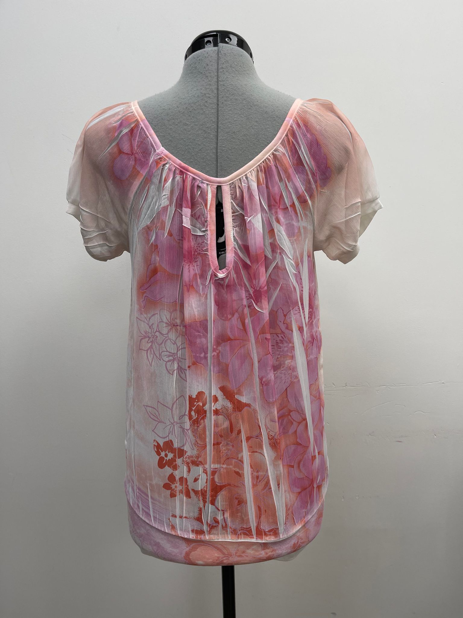 Details: Women's white with pink and orange floral print, short sleeve Maurices top.