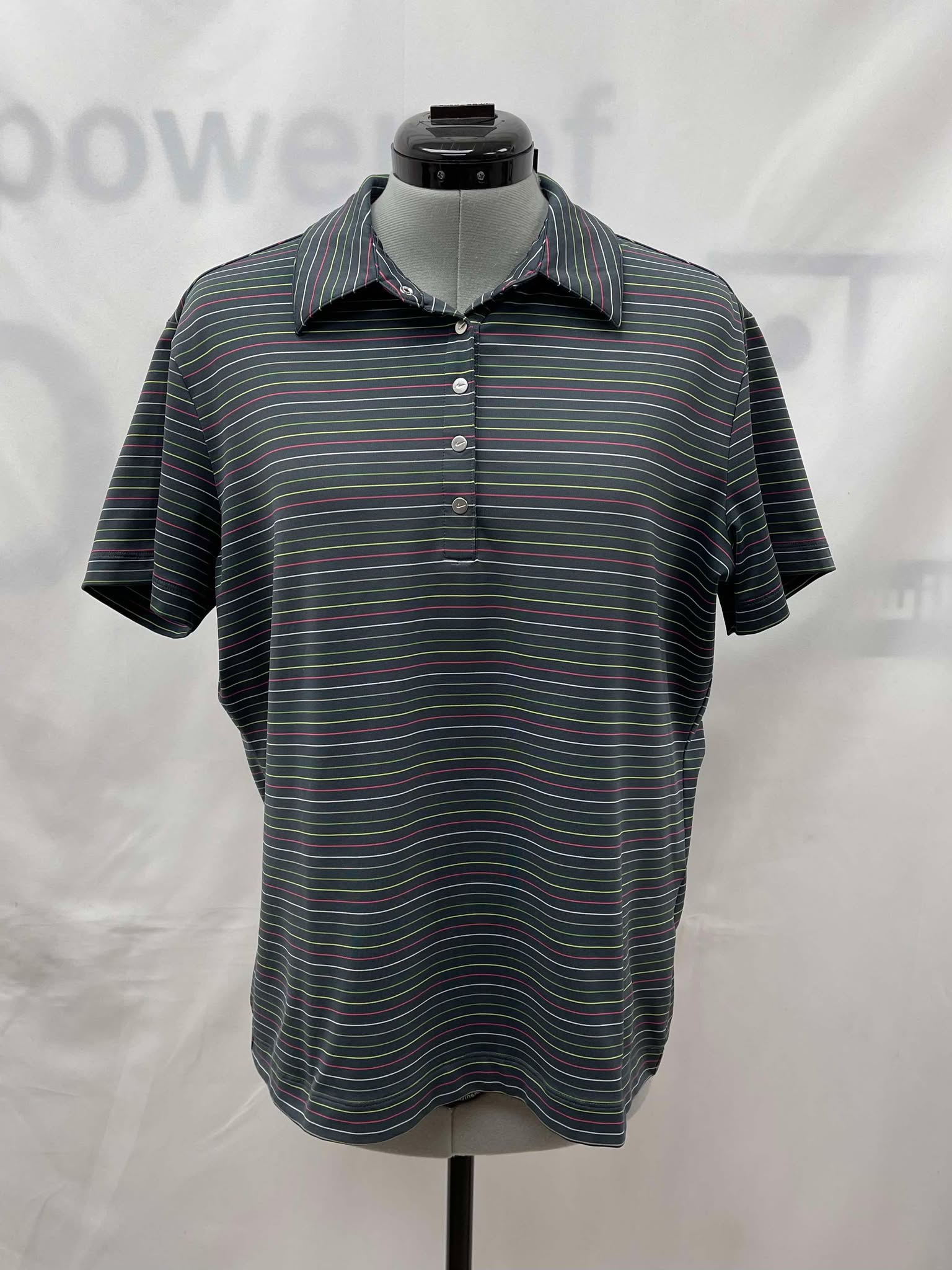 Details: Women's grey with white, pink, and green pinstripes, short sleeve Nike top.