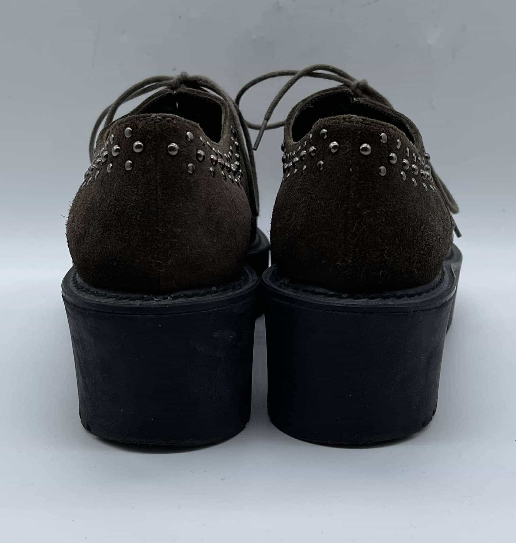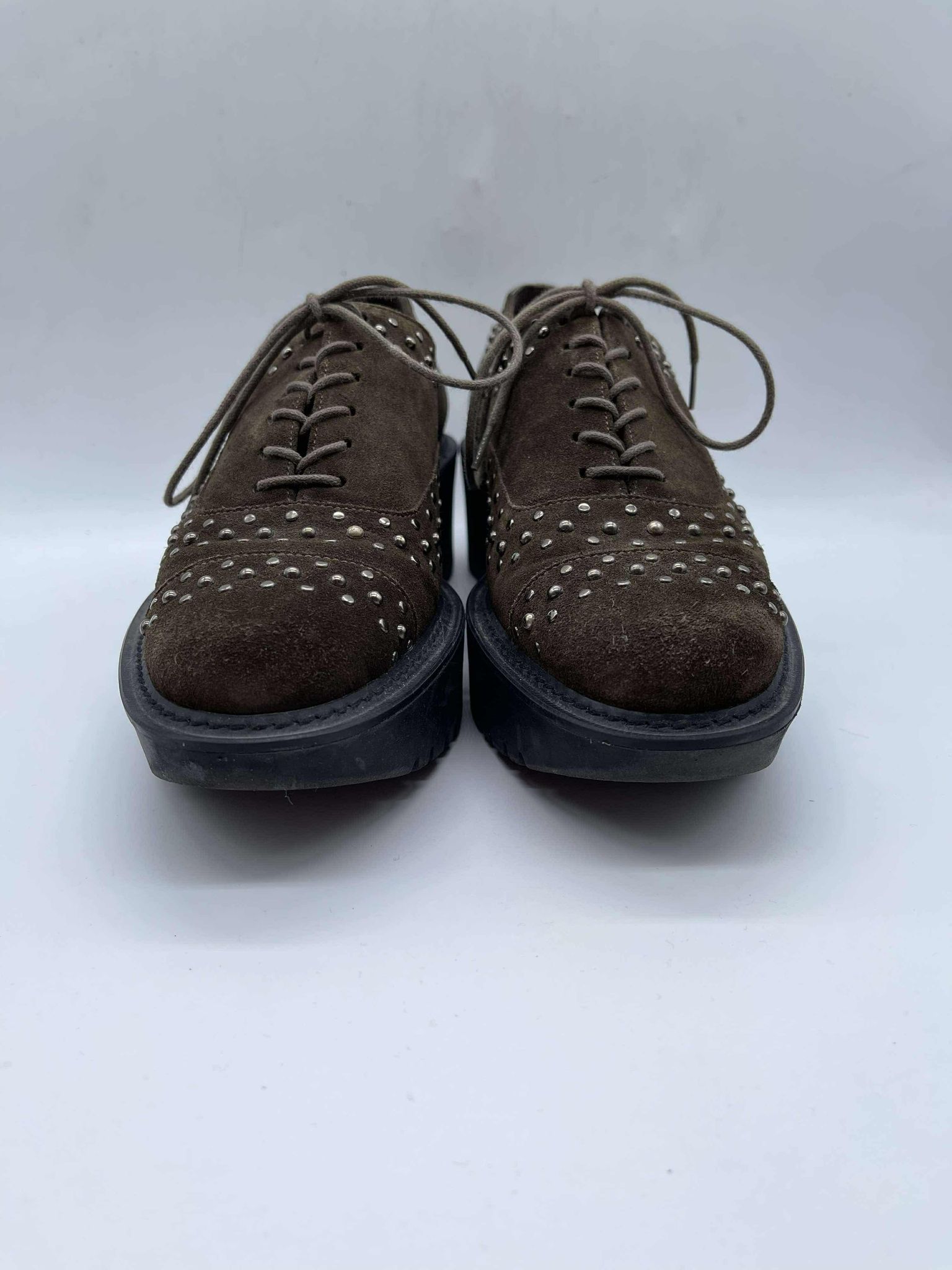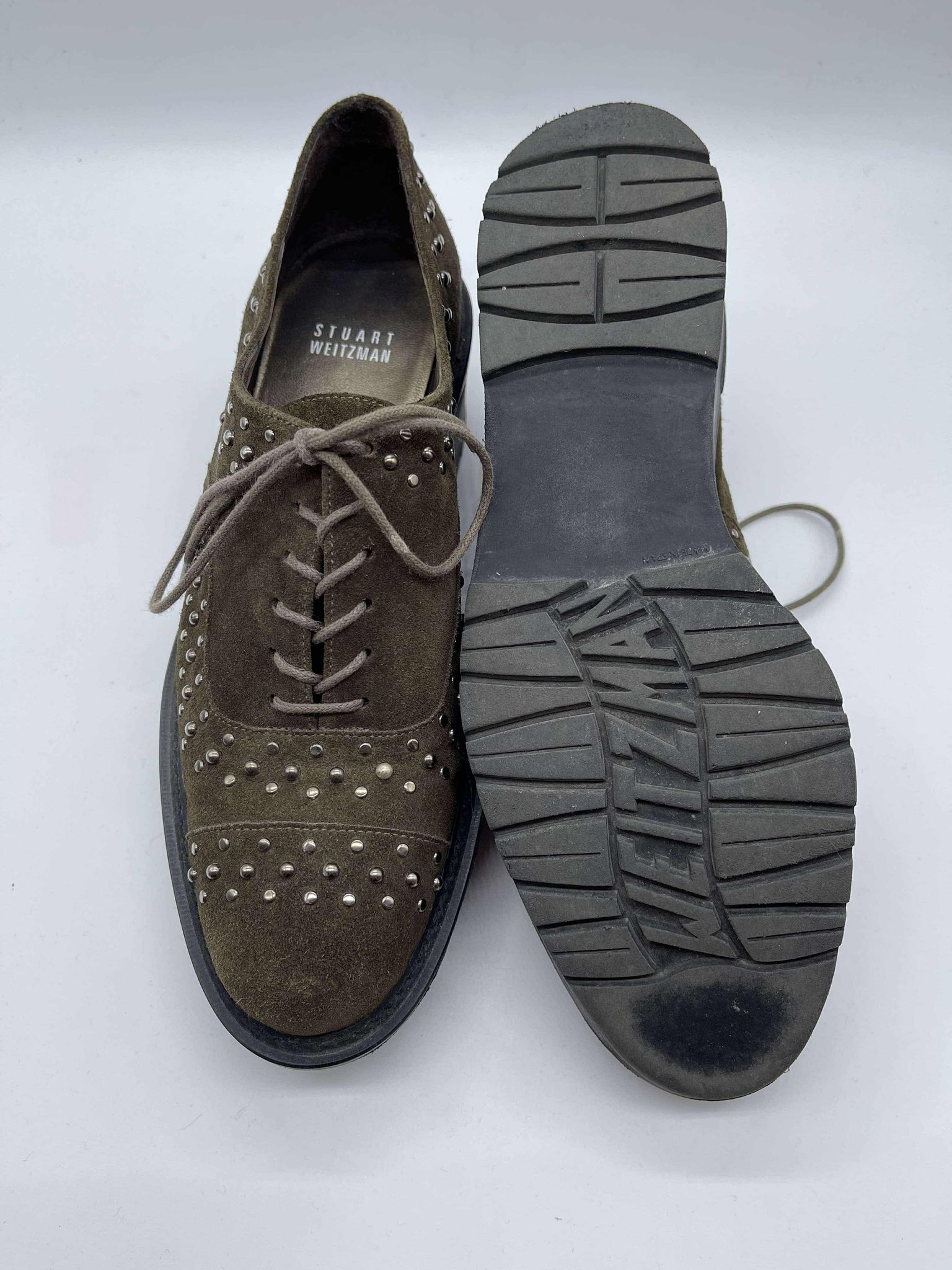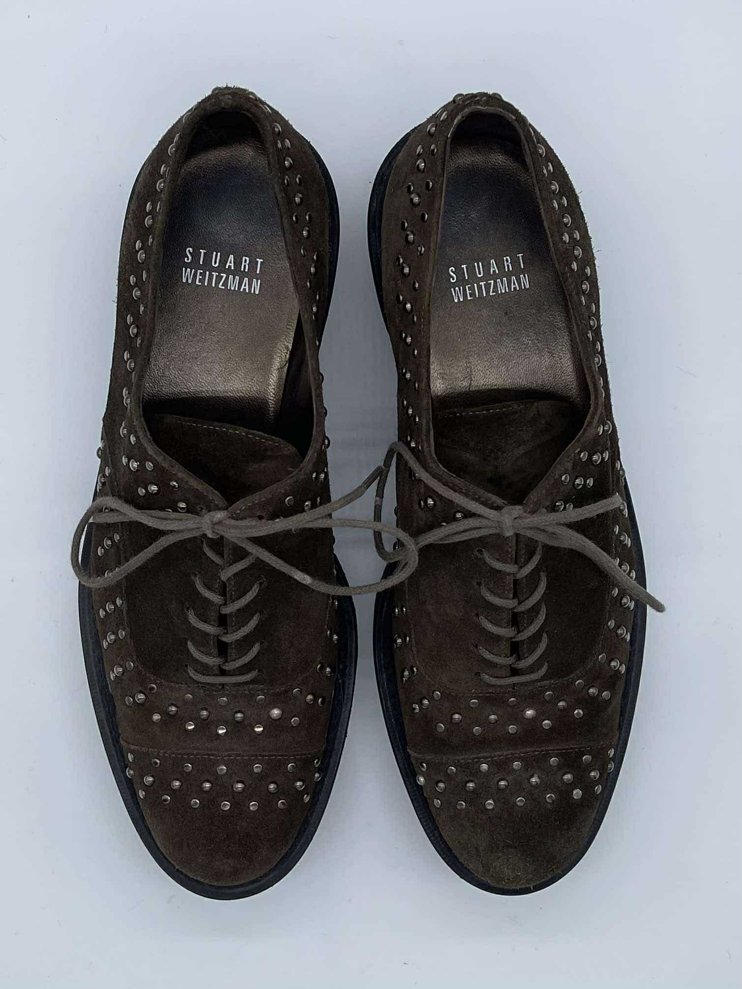 Details: Women's dark earth brown studded Stuart Weitzman shoes. (In original packaging)