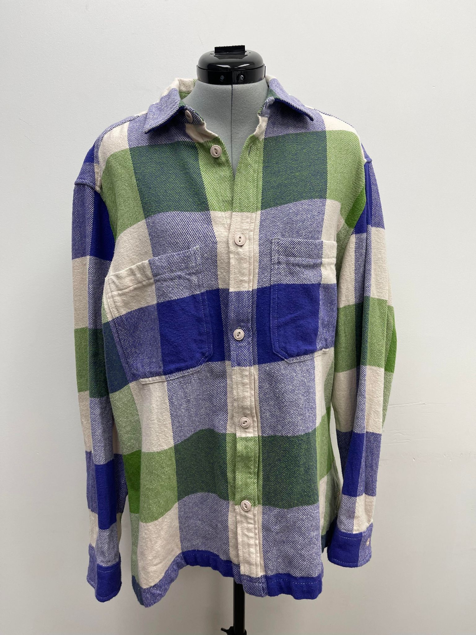 Details: Women's white, green and purple buttoned long sleeve shirt.