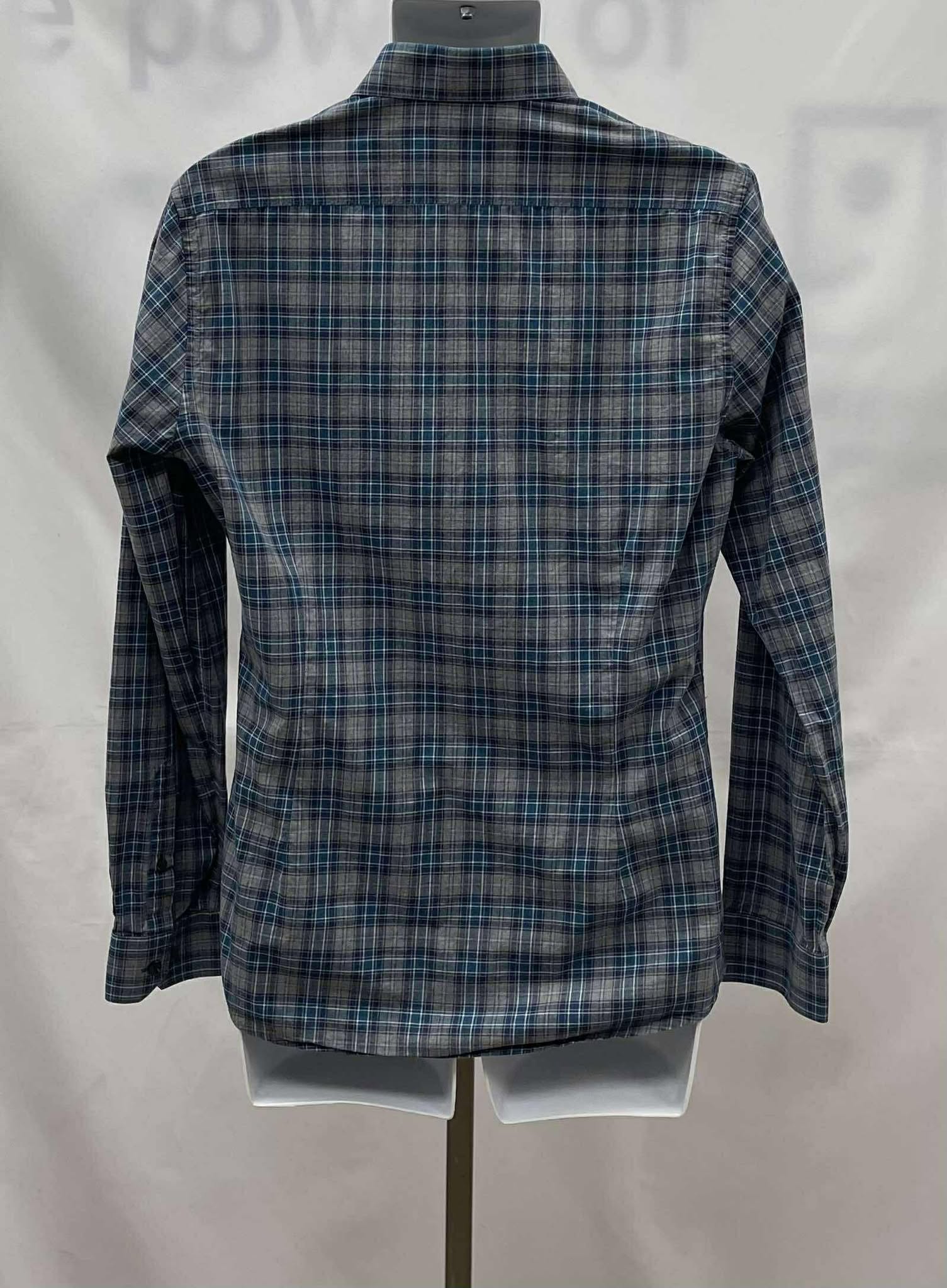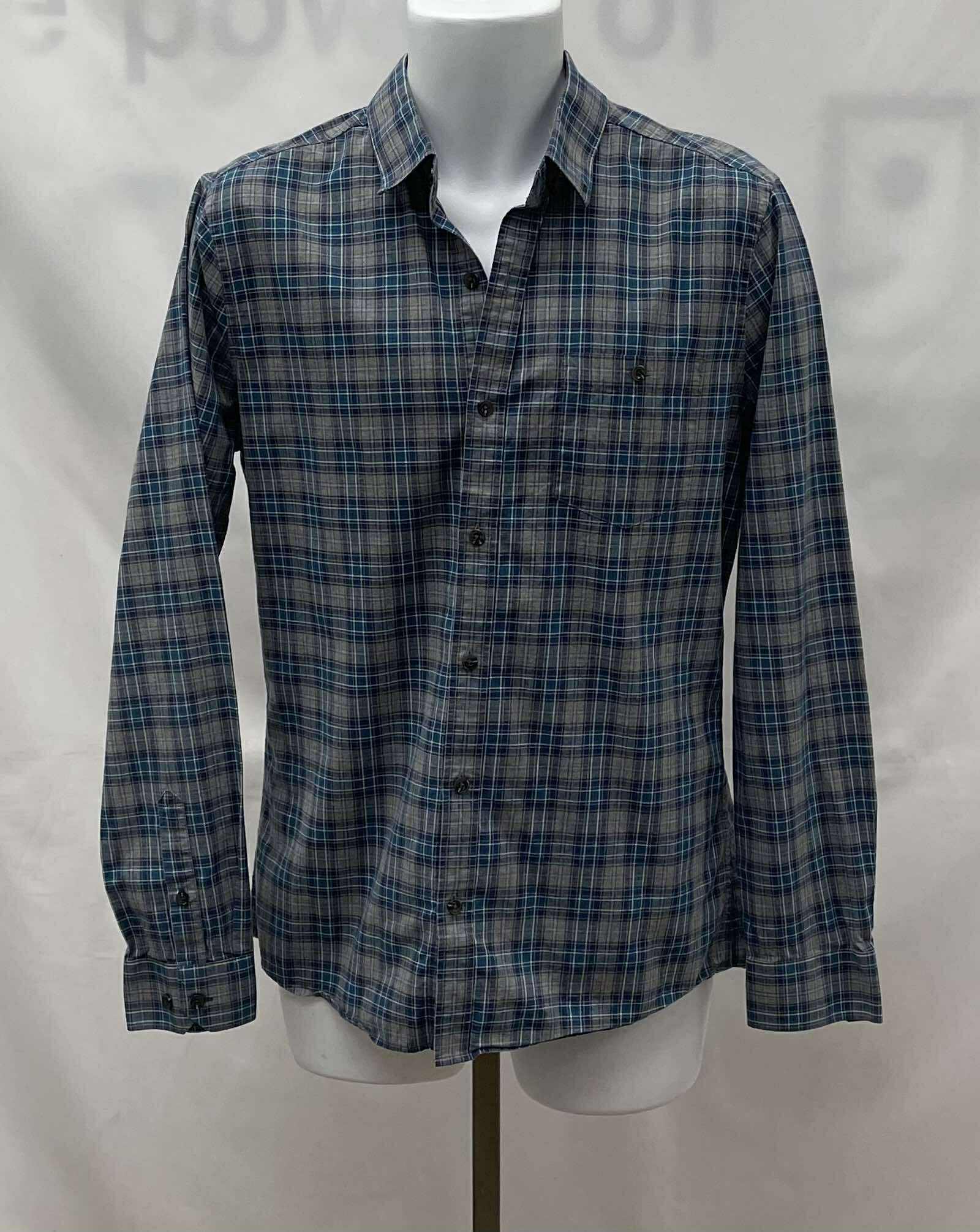 Details: Men's two tone grey and blue plaid, collared, long sleeve RW&CO shirt.