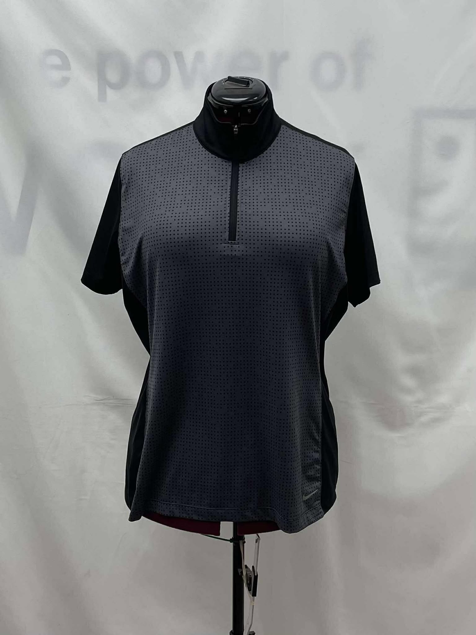 Details: Women's dark grey with black polka dotted front, short sleeve Nike too. ( As Is / Worn )